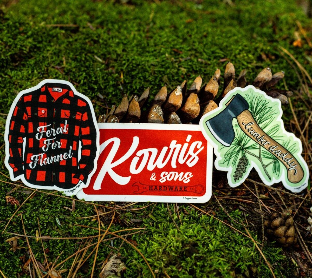 Lumberdaddy Sticker, Lumbersnack Sticker, Feral for Flannel Sticker, Silver Springs Coffee & Crystals Logo Sticker, Crystal Ball Sticker, Flower Crown Quote Sticker, Kouris & Son's Hardware Logo Sticker
